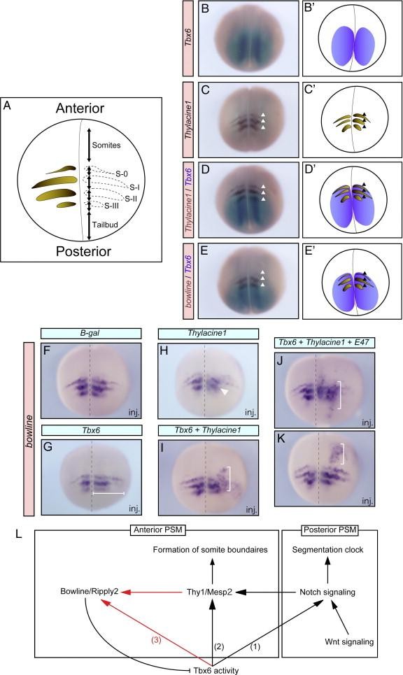 Fig. 7. Tbx6, Thy1, and E47 are spatiotemporally sufficient to induce bowline expression in Xenopus somitogenesis. (A) Schematic diagram of somites, somitomeres, and tailbud region of Xenopus neurula. Dorsal view is shown with anterior towards the top. The fictive expression shown in panel A is restricted to the anterior half of S-0, S-I, S-II, and S-III. The nomenclature of somites and somitomeres is based on the annotation of Pourquie and Tam (2001). (B) In situ hybridization for Tbx6 (blue). (C) In situ hybridization for Thy1 (arrowhead; brown). (D) Double in situ hybridization for Tbx6 (blue) and Thy1 (arrowhead; brown). (E) Double in situ hybridization for Tbx6 (blue) and bowline (arrowhead; brown). (Bâ²âEâ²) Schematic diagrams of gene expression in panels B (Bâ²), C (Câ²), D (Dâ²), and E (Eâ²). (FâK) In situ hybridization for bowline. Embryos were unilaterally injected with DNA for β-gal (100 pg; F), Tbx6 (50 pg; G), Thy1 (50 pg; H), a mixture of Tbx6 and Thy1 (50 pg each; I), and a mixture of Tbx6, Thy1, and E47 (33 pg each; J and K). The white bar indicates expanded bowline expression (G). The white arrowhead indicates disrupted bowline expression (H). The white brackets indicate ectopically induced bowline expression (I, J, and K). Injected sides are to the right and dorsal views are shown with anterior towards the top. (L) Diagram illustrating a stepwise regulatory model of somitogenesis involving Tbx6. (1) Tbx6 may participate in the segmentation clock system via the regulation of Notch ligand Dll1 (Notch signaling component) in mouse ([Hofmann et al., 2004] and [White and Chapman, 2005]). (2) Tbx6 may be involved in the formation of somite boundaries via regulation of Thy1/Mesp2 in mouse and X. laevis ([Kondow et al., 2007] and [Yasuhiko et al., 2006]). (3) We propose a novel participation of Tbx6 in termination of the somite segmentation program, whereby Tbx6 directly activates bowline expression together with Thy1/E47, and Bowline in turn suppresses the transcriptional activity of Tbx6 (Kondow et al., 2007). The actions represented by red arrows are based on our new findings.