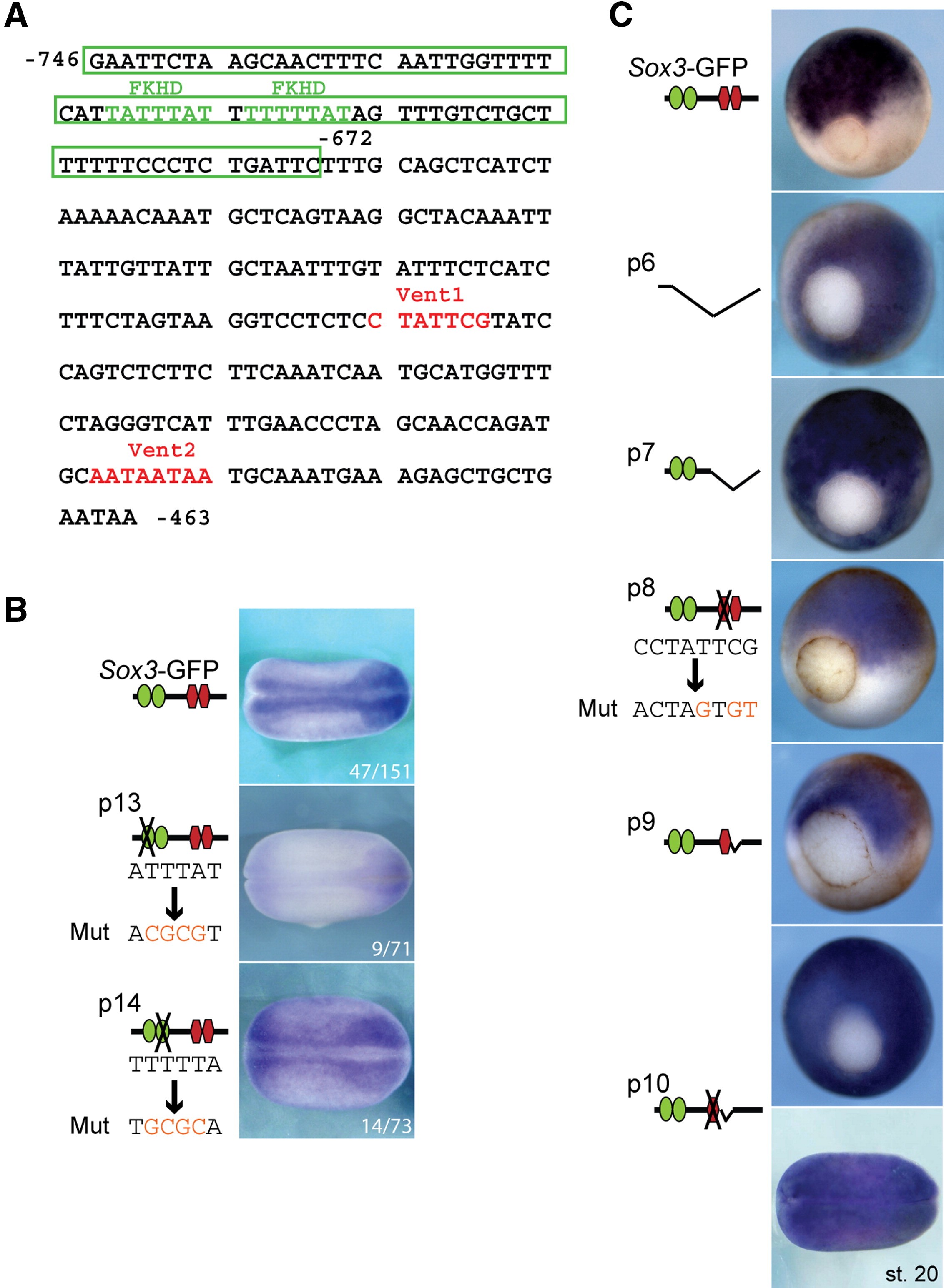 Fig. 6. Identification of transcription factor binding sites required for regulation of sox3-GFP expression. (A) Sequence of regulatory elements and putative transcription factor binding sites. The boxed region is the putative activator module, A2, which is deleted in p4. The remaining sequence is the putative repressor module, R1 which is deleted in p7. The entire region in A plus sequences up to â 299 are deleted in p6. Putative forkhead (FKHD) binding sites are labeled in green and putative Vent1 and Vent2 sites are in red. (B) WISH of transgenic embryos (stage 17â20) expressing sox3-GFP constructs. Embryos are a dorsal view with anterior to the right. A diagram of the upstream regulatory region shown in A is on the left. The numbers in the lower right hand corner refer to the number of embryos with the expression pattern shown over the total number of embryos. (C) WISH of transgenic embryos (stage 12) expressing sox3-GFP constructs. Embryos are a vegetal view with dorsal to the top. An inverted triangle indicates a deletion and an X indicates that a site has been mutated. The total numbers of embryos with the expression pattern shown are in Table 1. Putative TF sites from panel A are represented schematically in the same colors: green circle, Fkhd; red hexagon, Vent1 and Vent2. |