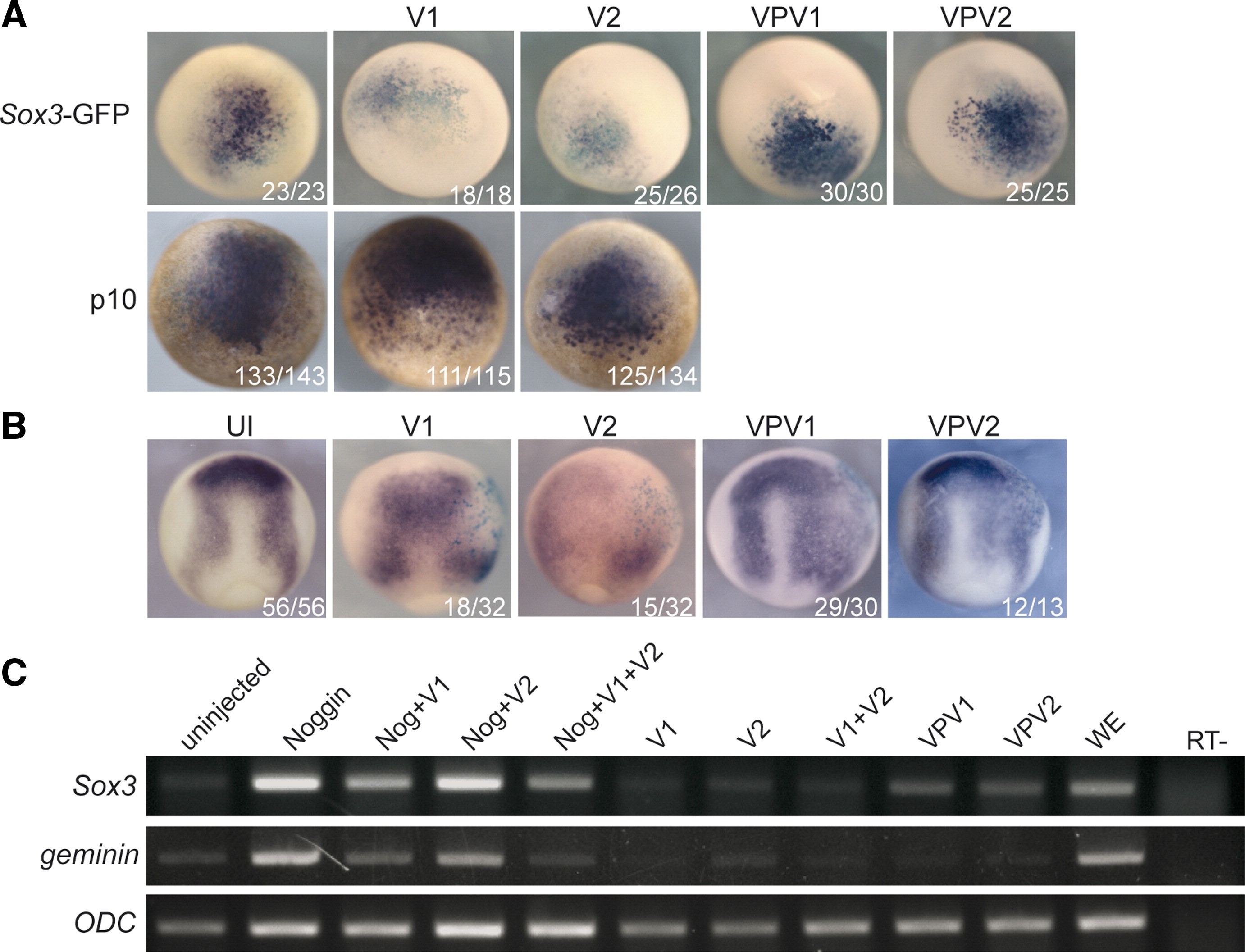 Fig. 7. Vent1 and Vent2 repress sox3 and sox3-GFP expression. (A) Animal pole view of WISH for GFP in stage 12.5 embryos injected at the 1-cell stage with 50 pg sox3-GFP DNA or p10 DNA (V1 and V2 sites mutated), lacZ mRNA as a tracer (light blue) and vent (V1), vent2 (V2), VPvent1 (VPV1) or VPvent2 (VPV2) mRNA. (B) WISH of sox3 in stage 12.5 embryos injected with lacZ mRNA and vent mRNA as indicated. 1 of 32 cells was injected with V1 or V2 mRNA and 1 of 2 cells was injected with VPV1 or VPV2 mRNA. Embryos are a dorsal view. The numbers in the right hand corner are the numbers of embryos with the same phenotype as that shown over the total number of embryos. (C) RT-PCR using primers to sox3, geminin or ODC as a loading control of either uninjected ectodermal explants or those injected with noggin, V1, V2, V1Â +Â V2, VPV1 and/or VPV2 mRNA. |