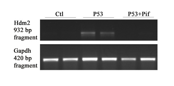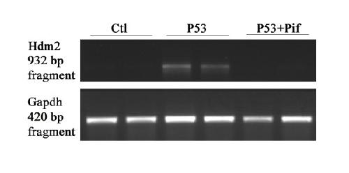 Figure 5. Activation of endogenous Hdm2 in H1299 cells by the axolotl p53 protein. Expression of the human p53 target gene (Hdm2) 24 h post transfection in H1299 cells mock transfected and transfected with the axolotl p53 without and with pifithrin-α grown at 30°C. RT-PCRs were also performed with the housekeeping gene glyceraldehyde phosphate dehydrogenase (Gapdh) to control for the amount of total RNA.