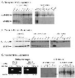 FIG. 3. Xenopus ePABP2 is expressed during oogenesis, in early embryos and in adult ovary tissue. A: Total RNA was isolated from Xenopus embryos at the indicated stages of development (the blot on the left) and various adult tissues (the blot on the right), fractionated by denaturing agarose gel electrophoresis and transferred to filters. Each filter was hybridized with a radiolabeled probe to detect mRNA encoding the Xenopus nuclear PABP2 (the upper panels, 1015 nucleotides). The filters were stripped and reprobed to detect Xenopus ePABP2 mRNA (the lower panels, 1260 nucleotides). B: Total protein was isolated from Xenopus oocytes at the indicated stages (blot on the left), embryos at the indicated stages of development (the blot in the middle), and various adult tissues (the blot on the right), fractionated by SDS polyacrylamide gel electrophoresis and transferred to filters. Five cells worth of protein were analyzed for the stage I, II, and III oocytes, whereas a single cells worth of protein was analyzed for stage IV and VI oocytes. Each filter was probed with the polyclonal -PABP2 antibodies to detect both Xenopus nuclear PABP2 and ePABP2. C: Mouse ePABP2 is expressed in early embryos and ovary tissue. cDNA generated from RNA isolated from mouse oocytes and blastocyst stage embryos was used as the template for PCR with primers for the ubiquitously expressed GAPHD mRNA or mouse ePABP2 mRNA (mePABP2). Both primer sets span one or more introns of the genomic sequence. Amplification was done for 30 and 40 cycles and the products analyzed by agarose gel electrophoresis. mRNA from the mouse tissues indicated was analyzed using RNA filter hybridization and a probe for mouse ePABP2 (the blot on the left, 1100 nucleotides). The same filter was stripped and reprobed for mouse cytoskeletal actin mRNA (the blot on the right). Mouse ePABP2 mRNA is expressed in ovarian tissue (**) but not other adult mouse tissues. Reproduced with permission of the Publisher, John Wiley & Sons.