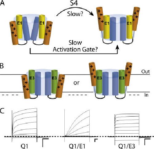 Figure 1. Cartoon models depicting possible mechanisms for KCNE1 and KCNE3 modulation of KCNQ1 channels (A) In Q1/E1 channel complexes, slow gating arises from either the slow transition of S4 voltage-sensing domains (orange with positive charges) from resting to active positions, or from slow activation gate opening. (B) Q1/E3 complexes are open at hyperpolarizing potentials (denoted by negative charges along the cytoplasmic membrane) because S4 voltage sensors are uncoupled from the opening of the gate (left), or because the equilibrium of voltage sensors is shifted to favor the activated state (right). (C) TEVC recordings of Q1 channels alone and partnered with E1 and E3 peptides in ND96 solution (Materials and methods). Oocytes were held at −80 mV, and currents were elicited from 4-s command voltages from −100 mV to +40 mV in 20-mV increments. Scale bars represent 0.5 μA and 0.5 s. Dashed line indicates zero current.