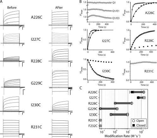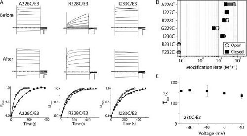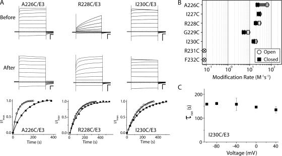 Figure 4. The equilibrium of S4 voltage sensors is shifted to favor the active state in KCNQ1/KCNE3 complexes. (A) TEVC recordings from A226C/E3, R228C/E3, and I230C/E3 complexes expressed in Xenopus oocytes before and after MTSET modification. Oocytes were held at −80 mV and currents were elicited from 4-s command voltages from −100 to + 40 mV in 20-mV increments. Scale bars represent 0.5 μA and 0.5 s. Dashed line indicates zero current. (B) Change in current monitored over time using 40-mV test pulses with continuous perfusion of 400 μM MTSET. In the “open” protocol (open circles), the channel complexes were depolarized 11% of the total time; “closed protocol” (filled squares) 0.6% of the total time. Currents from the open and closed protocols were normalized to the maximal change in current for comparison. Curves were fit to monoexponential time courses and the reaction rates are tabulated in Table I. (C) Comparison of MTSET modification rates for Q1/E3 S4 cysteine substitutions in the open (open circles) or closed (filled squares) protocols. The gray bar gives the fold-change in rate between the open and closed protocols. X-out open circles indicate no observed change of current using open protocol. Data were averaged from three to five oocytes ± SEM. (D) The rate of MTSET reaction with I230C/E3 channel complexes is independent of voltage. Oocytes were held at −80 mV, and for each voltage, 4-s pulses were followed by a −30 mV tail pulse (100 ms), which was used to monitor the change in current upon MTSET application. The modification reaction time constant from single exponential fits is plotted for each voltage potential. Data were averaged from three to four oocytes ± SEM.