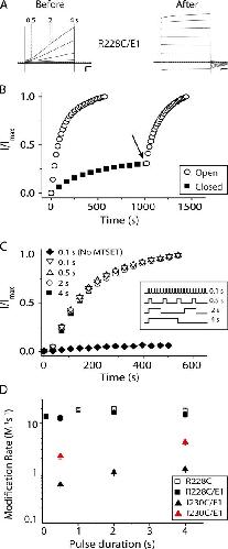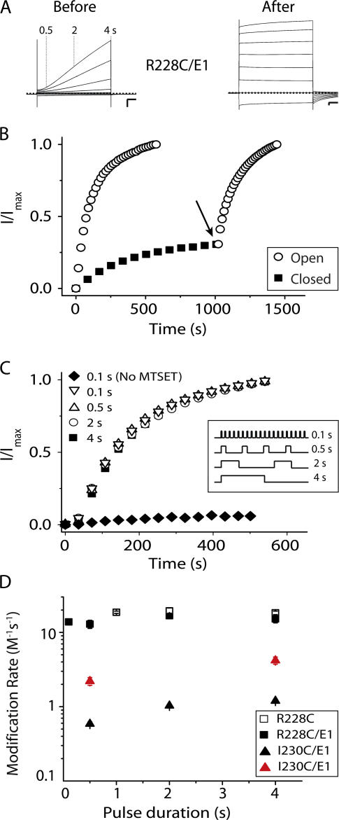 Figure 3. The S4 voltage sensor reaches equilibrium quickly in KCNQ1/KCNE1 complexes upon depolarization. (A) TEVC recordings from R228C/E1 complexes expressed in Xenopus oocytes before and after MTSET modification. Oocytes were held at −80 mV and currents were elicited from 4-s command voltages from −100 mV to +40 mV in 20-mV increments. Gray dotted lines denote the amount of current from a 40-mV depolarization at 0.5, 2, and 4 s. Scale bars represent 0.5 μA and 0.5 s. Dashed line indicates zero current. (B) Change in current for R228C/E1 monitored over time using 40-mV test pulses with continuous perfusion of 400 μM MTSET. In the “open” protocol (open circles) channels were depolarized 11% of the total time; “closed” protocol (filled squares) 0.6% of the total time. Shifting to the open protocol (arrow) after ∼1,000 s shows the completion of MTSET modification. Currents from the open and closed protocols were normalized to the maximal change in current for comparison. (C) Pulse duration has no effect on the rate of MTSET modification of R228C/E1. Representative plots from the MTSET reaction with R228C/E1 using 0.1, 0.5, 2, or 4 s 40-mV pulses, where the total depolarization time was kept constant (inset). The total MTSET exposure time is plotted versus normalized current at the end of the depolarization. Filled diamonds indicate the interpulse interval required to reset voltage sensors between pulses when no MTSET was added (900-ms interval for 100-ms pulse). (D) Comparison of R228C, R228C/E1, and I230C/E1 in pulse duration experiments. Black symbols represent modification by MTSET, red symbols modification by MTSES. Data were averaged from three to six oocytes ± SEM.