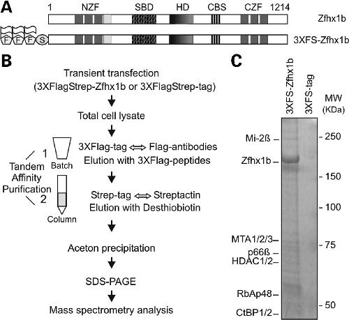 Tandem affinity purified Zfhx1b complexes contain multiple subunits of NuRD. (A) Graphic presentation of the mouse Zfhx1b protein and the N-terminally 3XFS-tagged variant. The N-terminal and C-terminal zinc finger domains (NZF and CZF), Smad-binding domain (SBD), homeodomain-like domain (HD), the C3H type zinc finger (light grey box) and the CtBP interacting sites (CBS) are shown. (B) Schematic representation of the variant tandem affinity purification procedure. The first purification involves an in-batch Flag-IP of extracts of HEK293T cells, containing transiently synthesized 3XFS-Zfhx1b proteins. Upon elution with 3XFLAG peptides, the eluted proteins were applied to a streptactin-agarose column for a second purification. Precipitation was done using acetone. (C) Brilliant blue G-colloidal staining of the purified proteins from HEK293T cells transiently producing 3XFS-Zfhx1b or 3XFS-tag only. Co-purified proteins were identified by MS.