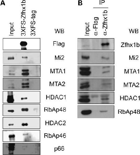 Figure 2. Zfhx1b associates with several subunits of the NuRD complex. (A) Extracts of HEK293T cells containing transiently synthesized 3XFS-Zfhx1b or 3XFS tag as negative control were precipitated in a Flag-dependent manner and eluted using 3XFLAG peptides. Western-blot analysis was performed using antibodies directed against the NuRD subunits. (B) IP of HEK293T cell extracts with Zfhx1b-specific or control anti-Flag antibodies, followed by Western-blot analysis using NuRD subunit-specific antibodies.