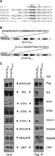 Figure 4. Zfhx1b associates with NuRD via its N-terminal domain. (A) Graphic presentation of wild-type (WT) full-length (FL) and mutant Zfhx1b proteins used in this study. (B) Western-blot detection showing co-immunoprecipitation of Flag-MTA2 and RbAp48, and HA-HDAC2 with the respective Zfhx1b proteins (triangle) tested.