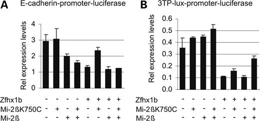 A dominant-negative variant of Mi-2β interferes with Zfhx1b-mediated repression of specific target promoters in reporter constructs. HEK293T cells were transiently transfected with constructs coding for Zfhx1b, wild-type or mutant Mi-2βK750C polypeptides, and the E-cadherin (A), or 3TPlux reporter constructs (B). Cells were harvested 48 h after transfection and were analyzed for luciferase activity. β-galactosidase activity corrected luciferase values are given.