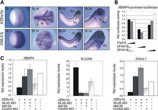 Figure 6.XZfhx1b depends on intact XMi-2β activity in early neural tissue formation. (A) Whole-mount in situ hybridization with a cRNA probe for XZfhx1b and XMi-2β at the indicated developmental stages; ba, branchial arches; ev, eye vesicle; nc, neural crest; nt, neural tube; s, somites. (B) The indicated plasmids were transfected into HEK293T cells and cells were analyzed 48 h later for the XBMP4 promoter-driven luciferase activity. β-Galactosidase-corrected luciferase values are given. Note that ZFHX1BWT represses the activity of the reporterconstruct in a dose-dependent manner, while repression by ZFHX1BAZmut proteins is significantly reduced. (C) QRTâPCR expression analysis of the indicated genes on total RNA isolated from animal caps derived from embryos injected with XZfhx1b RNA alone (200 pg/blastomere), co-injected with MOs against XMi-2β, co-injected with MOs against XMi-2β and hMi-2β RNA, co-injected with control MOs, or non-injected. Values were corrected for H4. Note that overexpression of XZfhx1b represses XBMP4 and the BMP-dependent gene XVent-1 and induces the neural gene N-CAM, while knock-down of XMi-2β alleviates XZfhx1b-dependent repression and induction of the respective genes.