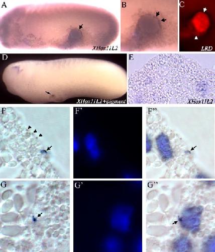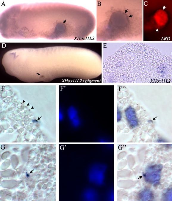 Fig. 3. RB sensory neurons are induced in both donor neural and host epidermal tissue. (AâC) The location of ectopic XHox11L2 expression (A, B) compared to the location of lysinated rhodamine dextran (LRD, C) labeling donor neural plate tissue reveals that RB induction occurs at the border of the transplanted tissue. In embryos with pigmented neural plate tissue transplanted into the ventralectoderm of an albino host, XHox11L2 appears within the region of the graft as seen in whole mount (D, 3.2Ã). (EâG) Sections of this tissue reveal the tissue contributions to ectopic XHox11L2-expressing cells. (E) Endogenous XHox11L2 stains cells in the dorsal neural tube bilaterally, shown at 40Ã. (FâF) Some ectopic XHox11L2 expression (arrow, F and F) was found in donor cells that contained pigment granules (arrowhead, F). Host tissue lacking pigment granules also expressed ectopic XHox11L2 (GâG). Blue Hoescht staining reveals the nucleus of each cell in the field in the sectioned tissue (Fâ²âF, Gâ²âG).