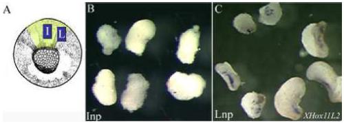 (A) Schematic diagram of stage 11.5 Xenopus laevis embryo, vegetal view with the neural plate shaded in yellow, showing the region from which intermediate ( and lateral ( neural plate explants were taken to determine the competence of these tissues. (B, C) Intermediate (np and lateral (np neural plate explants were taken from stage 11.5â12 embryos and allowed to develop until stage-matched intact embryos reached stage 24â25. Intermediate neural plate explants stained negative for XHox11L2 expression (B), while lateral neural plate explants stained positive (C). (A) Modified from Nieuwkoop and Faber, 1994.