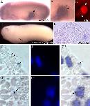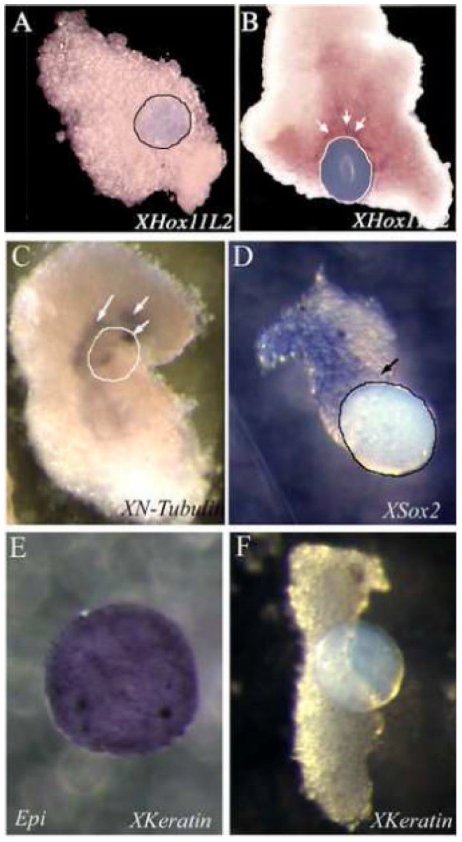 In situ hybridization of intermediate neural plate explants (A-D,F) or epidermal ectoderm (E) isolated at stage 11.5â12 and subsequently incubated with a heparin bead with or without hBMP4 (A-D,F) until stage-matched controls reached stage 24â25. (A) Intermediate explants incubated with a 0.5MBS-soaked bead never expressed the RB marker XHox11L2. Intermediate explants incubated with 1 ng/ml BMP4 stained positive for XHox11L2 (arrows in B) and XN-tubulin (arrows in C; white circle indicates position of the bead observed as an impression, since the bead was displaced during processing). (D) Expression of XSox2 in explants incubated with 1ng/ml BMP4 beads suggests that neural tissue is maintained in the area around the beads. (E) Epidermal explants stained positive for XKeratin, while neural plate explants incubated with 1 ng/ml BMP4 did not (F).