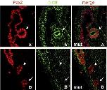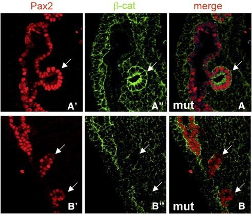 Fig. 1. Sagittal sections through e11.5 β-catenin mutant Wolffian ducts. β-Catenin staining shows that extruded epithelia can be either wildtype (A) or mutant (B). Ducts have been double stained with antibodies for Pax-2 (single channel red in panels Aâ² and Bâ²) and β-catenin (single channel green in panels A and B). Arrows indicate ectopic epithelia.