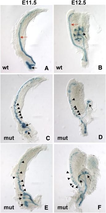 Fig. 2. Development of the Wolffian duct and ureteric bud at e11.5 and e12.5. Lac-Z stained e11.5 (A, C, E) and e12.5 (B, D, F) Hoxb7-Cre; β-catenin+/c; ROSA+/â (wildtype, A and B) and Hoxb7-Cre; β-cateninâ/c;ROSA+/â (mutant, CâF) urogenital systems. Hoxb7-Cre is active in the Wolffian duct (red arrows) and ureteric bud (black arrows) of e11.5â12.5 urogenital systems (A and B). β-Catenin mutant collecting ducts show multiple ectopic bud structures branching from the Wolffian duct (arrowheads in panels CâF) and defective branching of the ureteric buds (black arrows in panels CâF).