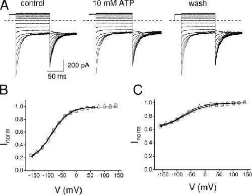 Figure 2. Effect of ATP on the gating of hClC-1. (A) macroscopic current recordings from an inside-out patch upon perfusion with control internal solution (left), during application of 10 mM ATP (middle), and after washout (right). (B) Voltage dependence of the overall open probability obtained from the macroscopic currents in A as described in Materials and methods. Symbols are: square, control; circle, 10 mM ATP; triangle, wash. Lines are fits of Eq. 1 with the following parameters: control, V1/2 = −89 mV, Pmin = 0.14; 10 mM ATP, V1/2 = −88 mV, Pmin = 0.13; wash V1/2 = −87 mV, Pmin = 0.14. (C) Effect of ATP on the slow gating mechanism of hClC-1. Data are from the same patch and were obtained from tail currents preceded by a 200-μs pulse to 160 mV. Symbols are as in B. Lines are fits of Eq. 1 with the following parameters: control, V1/2 = −82 mV, Pmin = 0.59; 10 mM ATP, V1/2 = −81 mV, Pmin = 0.58; wash V1/2 = −78 mV, Pmin = 0.63.