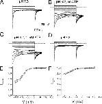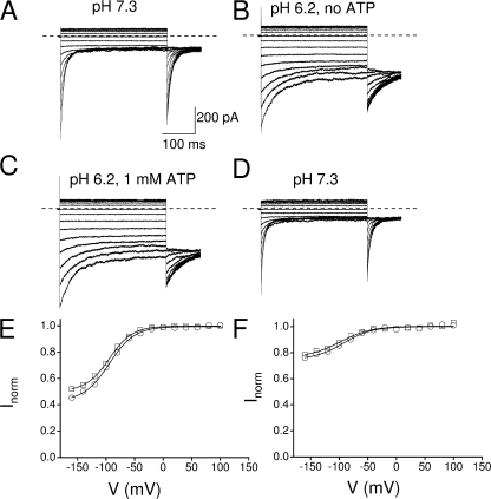 Figure 4. Effect of ATP on the gating of hClC-1 at pH 6.2. Top panel, macroscopic current recordings from an inside-out patch upon perfusion with control internal solution at pH 7.3 (A), pH 6.2 (B), solution at pH 6.2 with 1 mM ATP (C), and after washout (D). (E) Voltage dependence of the overall open probability obtained from the macroscopic currents in the top panel as described in Materials and methods. Symbols are: square, internal solution at pH 6.2; circle, solution at pH 6.2 with 1 mM ATP. Lines are fits of Eq. 1 with the following parameters: solution at pH 6.2, V1/2 = −94 mV, Pmin = 0.50; solution at pH 6.2 with 1 mM ATP, V1/2 = −95 mV, Pmin = 0.43. (F) Effect of ATP at pH 6.2 on the slow gating mechanism of hClC-1. Data are from the same patch and were obtained from tail currents preceded by a 200-μs pulse to 160 mV. Symbols are as in E. Lines are fits of Eq. 1 with the following parameters: solution at pH 6.2, V1/2 = −98 mV, Pmin = 0.74; solution at pH 6.2 with 1 mM ATP, V1/2 = −93 mV, Pmin = 0.74.