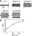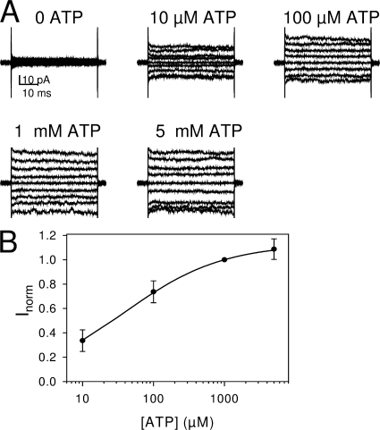 Figure 1. ATP stimulation of currents mediated by ΔR-CFTR. (A) Current recordings from an inside-out patch upon perfusion with control internal solution (left), and with solutions containing ATP as indicated in the panels. Voltage pulses are from −80 to 80 mV in 20-mV increments. Capacity transients are not subtracted. (B) ATP dependence of currents measured at 80 mV normalized to currents measured in 1 mM ATP. Error bars indicate SD (the data point at 1 mM has no error bar because it was used for the normalization). The solid line is the best fit of Eq. 2 with Kd = 38 μM and n = 0.63.
