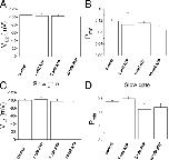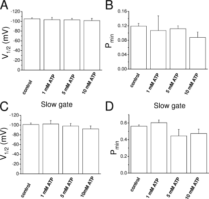 Figure 3. Statistical evaluation of the gating parameters V1/2 and Pmin at pH 7.3 obtained in control solution (n = 10) and in solutions containing 1 (n = 3), 5 (n = 5), or 10 mM ATP (n = 5). Mean values of V1/2 (A) and Pmin (B) obtained from the analysis of the overall gating mechanism of hClC-1. Mean values of V1/2 (C) and Pmin (D) obtained from the analysis of isolated slow gating mechanism of hClC-1. The values are not significantly different (P > 0.06 using Student's unpaired t test).