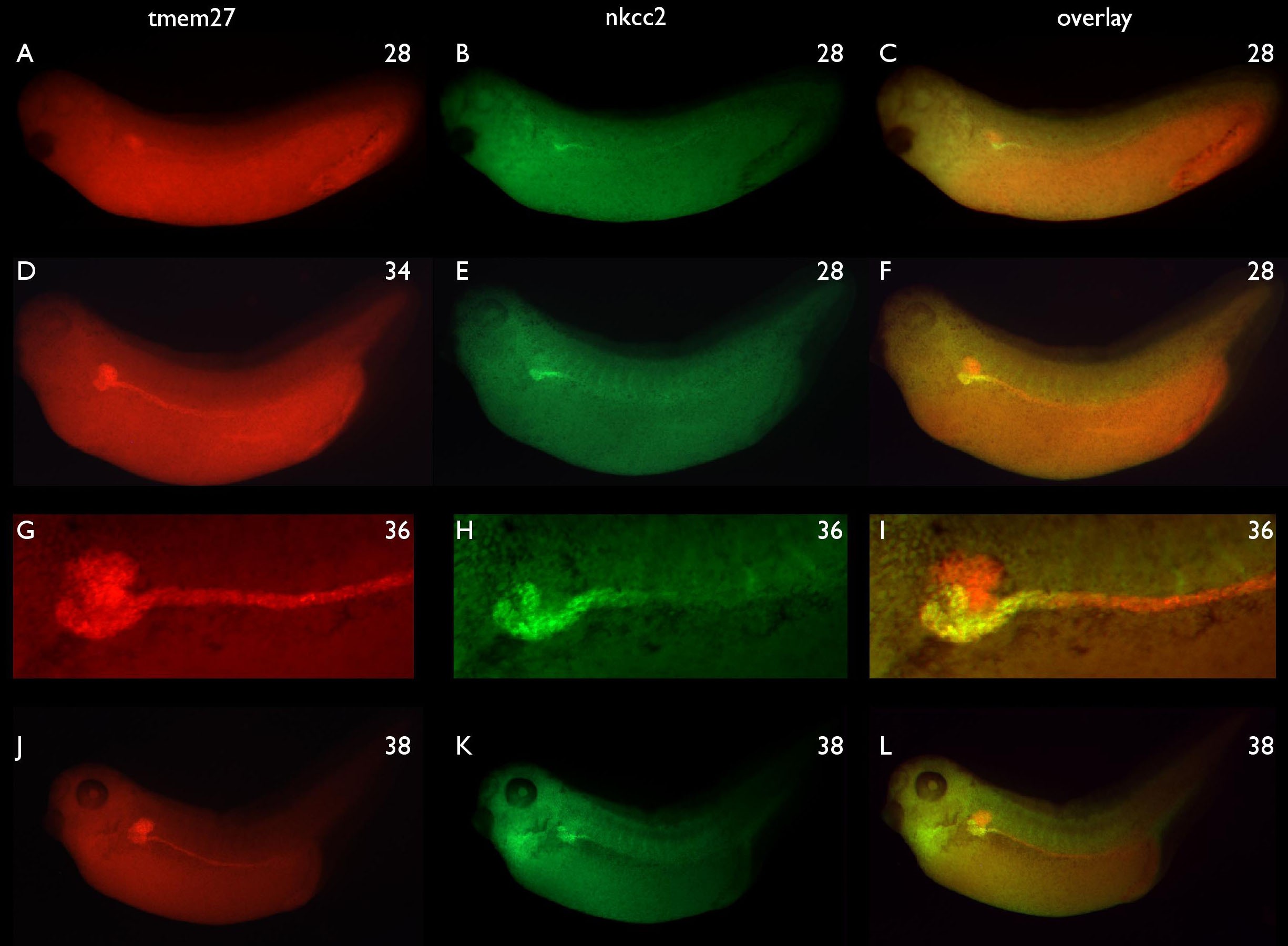 Collectrin/tmem27 encodes a transmembrane protein that plays a critical role in amino-acid transport. Originally described as being expressed only in collecting ducts, it has subsequently also been shown to also be expressed in the S1 segment of the proximal tubule of mammalian metanephric nephrons. In this report we describe the expression of collectrin in the simple embryonic kidney of amphibians, the pronephros. Each pronephros contains a single large nephron with a proximo-distal segmentation very similar to that of mammalian metanephric nephrons. Analysis of collectrin expression in pronephroi at a variety of embryonic stages indicates that this gene is expressed at very high levels throughout the pronephric system, including proximal and distal segments and the Wolffian duct. Expression in the pronephros commences at Xenopus embryonic stage 28 which corresponds to when epithelialization begins within the pronephric mesenchyme. Like the Na+K+ATPase/atp1a1, another highly expressed pronephric marker, collectrin is also expressed in the cloaca but not in the cloacal derived posterior segment of the Wolffian duct, the rectal diverticulum. Unlike the Na+K+ATPase, which is expressed at lower levels in proximal portions of the pronephric nephron, expression of collectrin is even throughout all of the pronephric epithelia. This expression domain extends far beyond that shown to express amino-acid transporters and indicates collectrin may function in facilitating additional transport processes. Its high level of expression and broad distribution make it an excellent marker with which to examine pronephric kidney development.