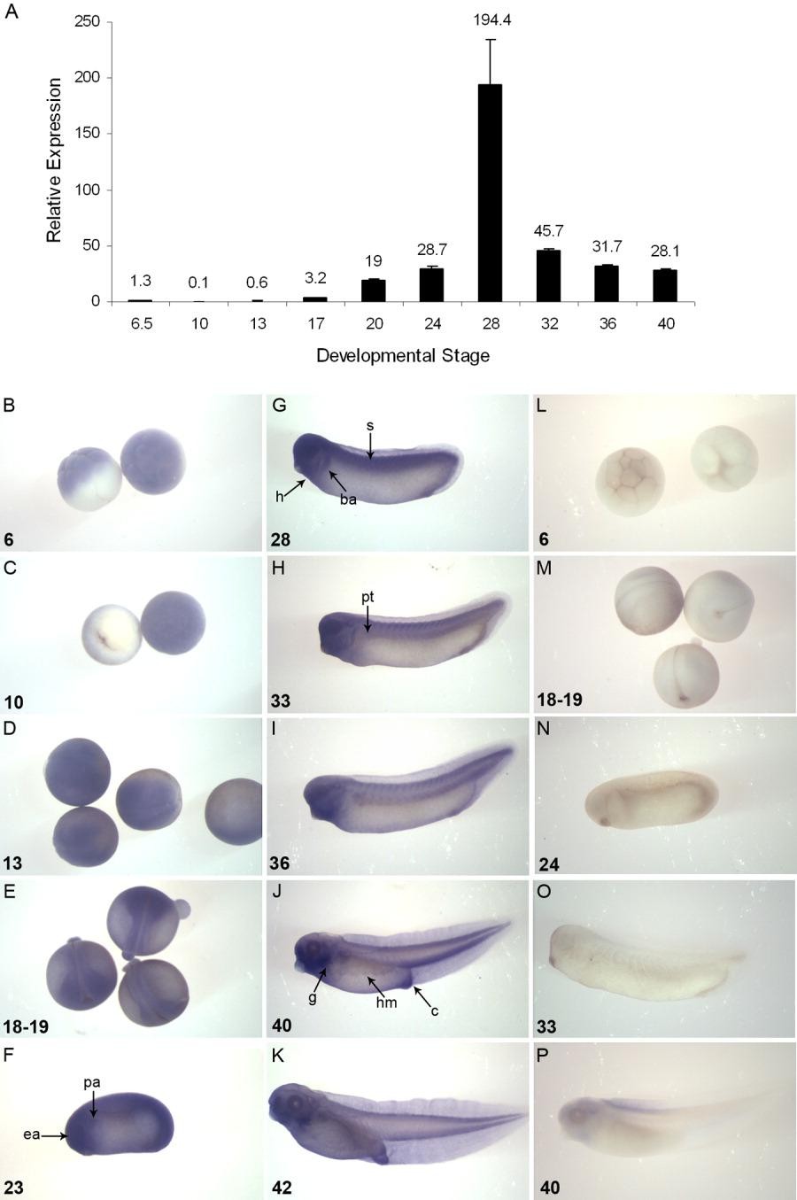 Figure 2. xWnt6 mRNA is expressed during Xenopus organogenesis. A: Quantitative reverse transcriptase-polymerase chain reaction analysis shows the relative expression levels of Wnt6 mRNA. Wnt6 expression is normalized to histone H4 levels. B-K: xWnt6 mRNA localization determined by whole-mount in situ hybridization using a digoxigenin-labeled xWnt6-specific LNA probe. L-P: Control embryos hybridized with a digoxigenin-labeled nonspecific LNA control probe. Numerical figures indicate the developmental stage. Note, xWnt6 mRNA initially localizes to animal pole and neural fold tissues, then more generally throughout the ectoderm and later in epithelial tissues and in the somites, the developing eye and pronephros. ba, branchial arches; c, cloaca; ea, eye anlage; g, gills; h, heart; hm, hypaxial muscles; nf, neural folds; pa, pronephric anlage; pt, pronephric tubules; s, somites. |