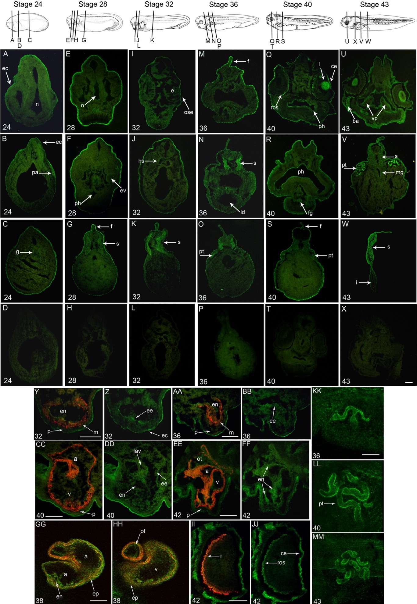 Figure 5. xWnt6 protein is localized within the ectoderm and epithelial tissues and within the developing heart, eye, and pronephros. A-C,E-G,I-K,M-O,Q-S,U-W: Immunofluorescence staining performed on cryosectioned embryos using an anti-Wnt6 antibody. D,H,L,P,T,X: Control sections stained without primary antibody and with secondary antibody alone. Y,Z,AA,BB,CC,DD,EE,FF: Higher magnification immunofluorescence staining performed on cryosectioned embryos using an anti-Wnt6 antibody (green) and an anti-troponin T antibody (red). GG,HH: Confocal optical frontal sections showing Wnt6 (green) and troponin T staining (red) in isolated Xenopus hearts. II,JJ: Immunofluorescence staining performed on cryosectioned embryos using an anti-Wnt6 antibody (green) and an anti-rhodopsin antibody (red). KK,LL,MM: Confocal three-dimensional images showing Wnt6 staining of the proximal tubules. The location of the sections is indicated for each developmental stage. Numerical figures indicate developmental stage. a, atrium; ba, branchial arches; ce, corneal epithelium; e, eye; ec, ectoderm, ee, endocardial endothelium; en, endocardium; ev, eye vesicle, f, fin; fav, future arterial valve; fg, foregut; g, gut; hs, head somite; i, intestine; l, lens; ld, liver diverculum; m, myocardium; mg, midgut; n, neuroceol; ose, ocular surface ectoderm; p, pericardium; pa, pronephric anlage; ph, pharynx; pt, pronephric tubules; r, rods; ros, rods outer segment; s, somite; vp, velar plate. Scale bars = 200 mu m in A-X, 100 mu m in Y-MM. |