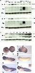 Figure 4. Wnt6 protein is expressed at different stages of development and is localized to the epidermis overlaying developing organs and at later stages to the pronephric tubules. A,B: Western blots showing both endogenous xWnt6 expression as well as overexpression of xWnt6 and mWnt6 in lanes two and three at 3 hr after injection (A) and 5 hr after injection (B). A,B middle panels: Immunodetection showing expression of myc-tagged proteins xWnt4 and xWnt5A at 2 hr and 5 hr after injection, respectively. A,B bottom panels: Immunodetection of ERK2, demonstrating relatively equal protein loading in each lane. C: Western blot showing xWnt6 protein expression at different stages of development. C bottom panel: Immunodetection of ERK2, demonstrating equal protein loading in each lane. D-F,H,I: Whole-mount immunocytochemistry staining using an anti-Wnt6 antibody. G: Control embryo stained without primary antibody and with secondary antibody alone. I: Insert showing close-up of xWnt6 protein expression in the pronephric tubules at stage 40. Numerical figures indicate developmental stage. e, eye; h, heart, p, pronephros; pt, pronephric tubules. |