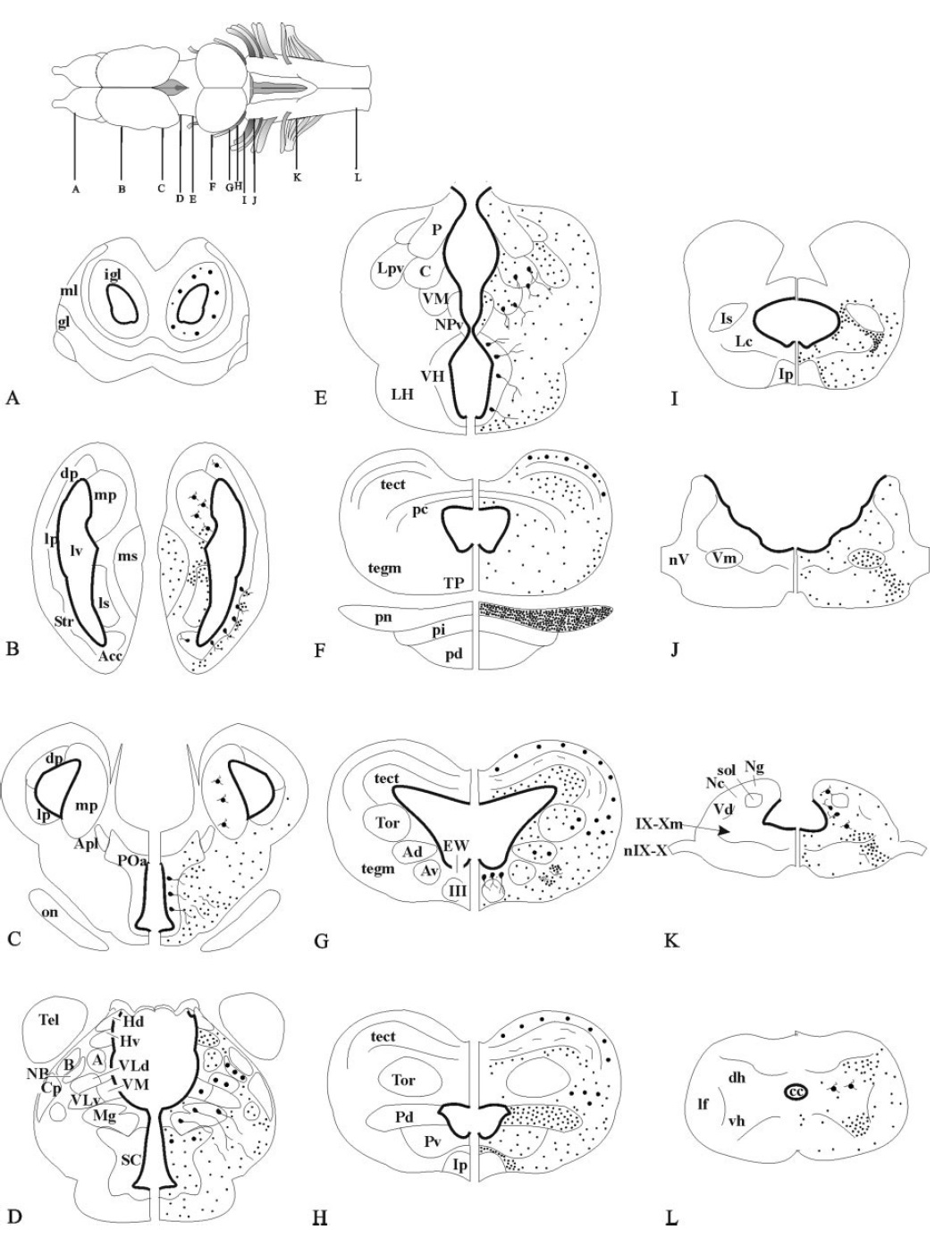 Fig. 1. A–L: Distribution of CARTp-immunoreactivity in schematic