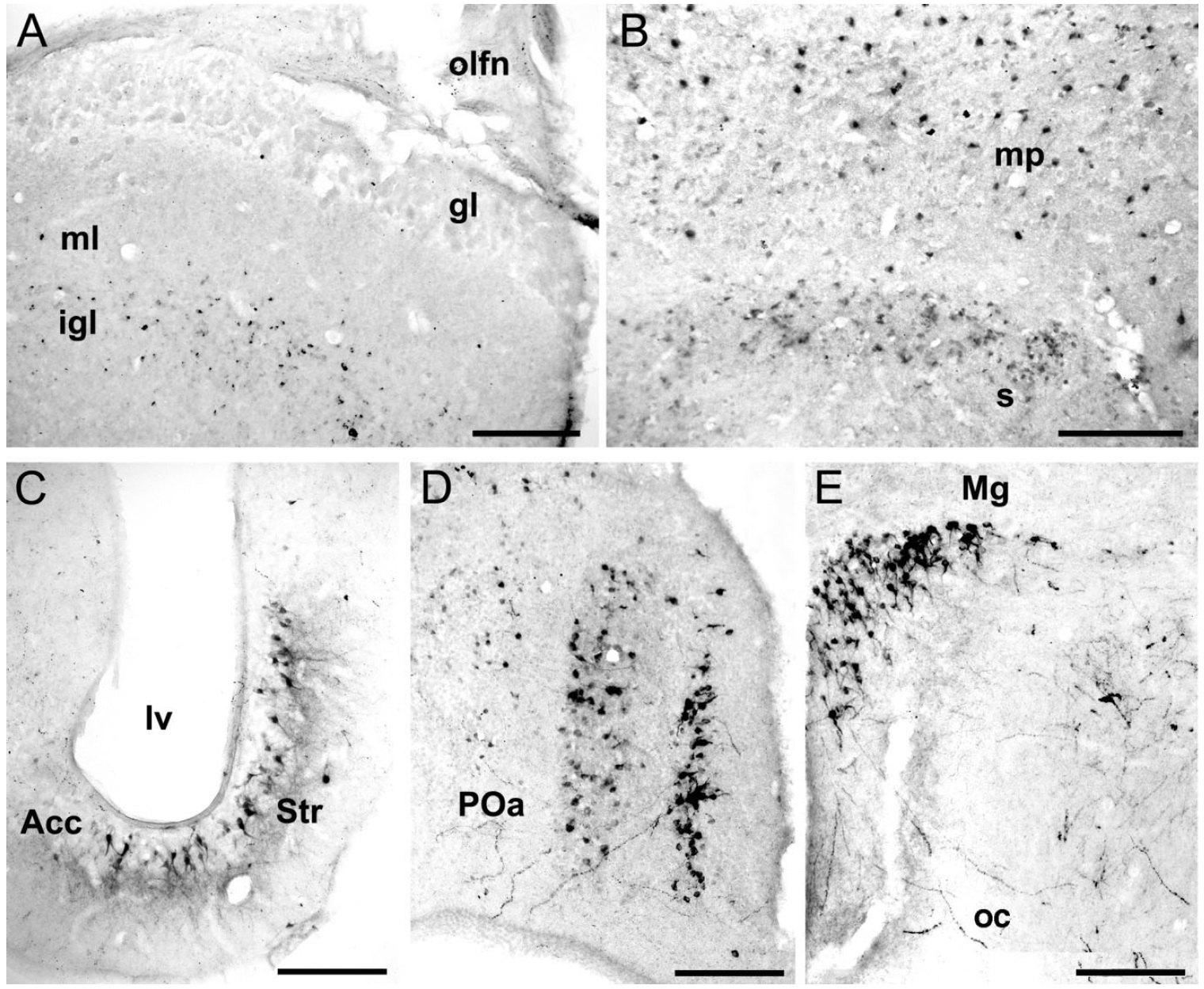 neurons in the preoptic area (POa). Sagittal section. E: Intensely