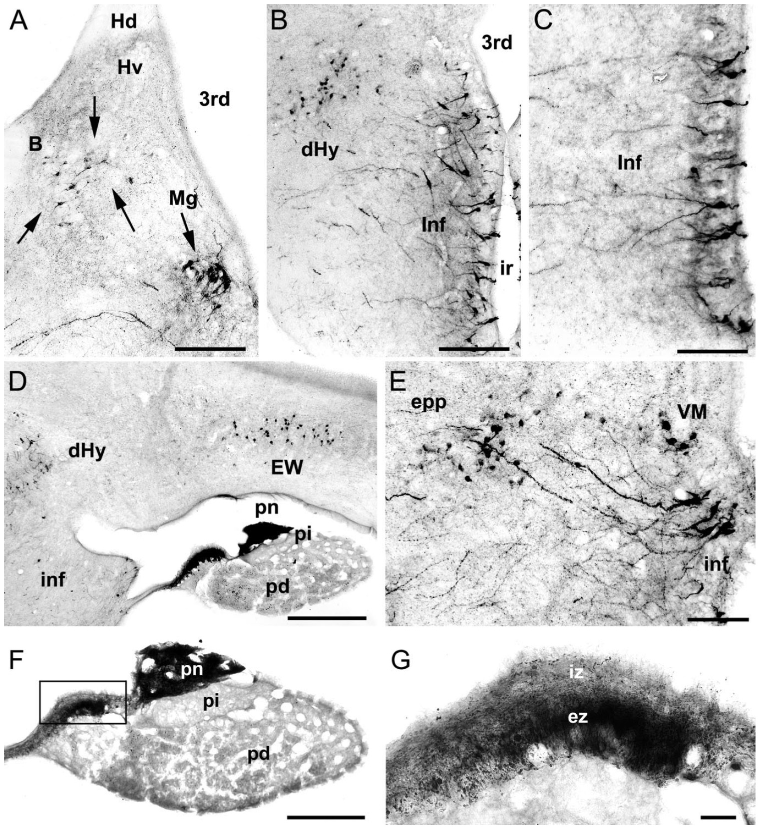 brain. D: Immunoreactive cells in the hypothalamus and the Edinger-