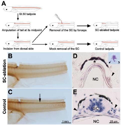 ???displayArticle.abstract??? Tail regeneration in urodeles is dependent on the spinal cord (SC), but it is believed that anuran larvae regenerate normal tails without the SC. To evaluate the precise role of the SC in anuran tail regeneration, we developed a simple operation method to ablate the SC completely and minimize the damage to the tadpole using Xenopus laevis. The SC-ablated tadpole regenerated a twisted and smaller tail. These morphological abnormalities were attributed to defects in the notochord (NC), as the regenerated NC in the SC-ablated tail was short, slim and twisted. The SC ablation never affected the early steps of the regeneration, including closure of the amputated surface with epidermis and accumulation of the NC precursor cells. The proliferation rate of the NC precursor cells, however, was reduced, and NC cell maturation was retarded in the SC-ablated tail. These results show that the SC has an essential role in the normal tail regeneration of Xenopus larvae, especially in the proliferation and differentiation of the NC cells. Gene expression analysis and implantation of a bead soaked with growth factor showed that fibroblast growth factor-2 and -10 were involved in the signaling molecules, which were expressed in the SC and stimulated growth of the NC cells.