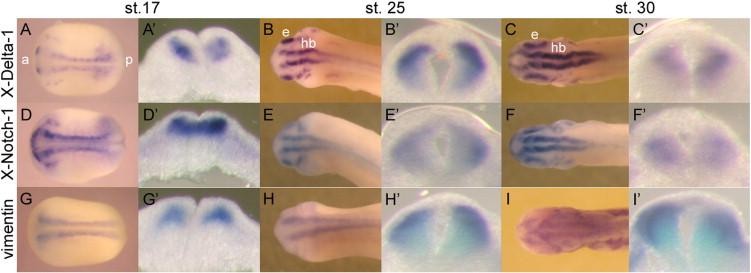 Fig. 1. X-Notch-1 overlaps the radial glia marker vimentin in Xenopus hindbrain. AâI: the expression of X-Delta-1 (AâC), X-Notch-1 (DâF) and vimentin (GâI) in embryos is shown. All panels are dorsal views, anterior toward left. A, D, G: stage 17, late neurula. B, E, H: stage 25, early tailbud. C, F, I: stage30, tailbud. Aâ²âIâ²: transversal sections cut at the level of prospective hindbrain or hindbrain in panels AâI, respectively. a: anterior, p: posterior, e: eye, hb: hindbrain.