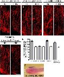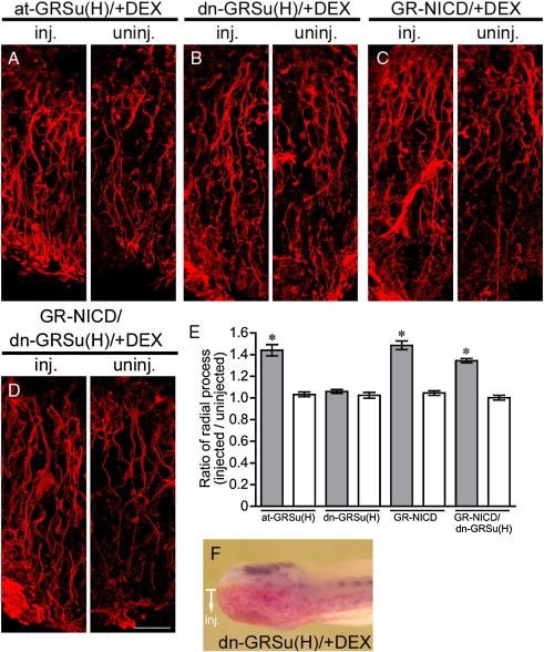 Fig. 4. Su(H) is sufficient but not required for radial glia formation. AâD: high magnification images of the injected and uninjected side of the hindbrain stained by anti-vimentin antibody in 250 pg at-GRSu(H)-injected (A), 500 pg dn-GRSu(H)-injected (B), GR-NICD-injected (C) and GR-NICD/dn-GRSu(H)-injected (D) embryos. Scale bar: 25 μm. E: RPratio between the injected and uninjected side of the hindbrain for each injection experiment. Gray bars or white bars indicate with or without DEX, respectively. *P < 0.001 compared with the ratio of each injection experiment without DEX. F: Whole-mount in situ hybridization analysis of XHey-1 expression in dn-GRSu(H)-injected embryos at stage 34 (n = 24/25). The injected side in each embryo is indicated by nucβ-Gal staining (red color).