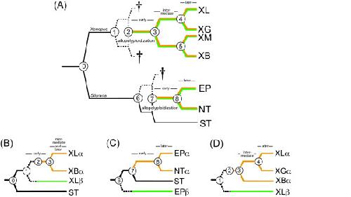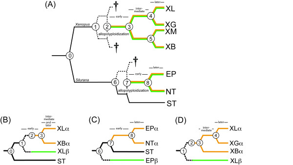 Figure 1. Phylogenetic and genealogical relationships of species and paralogs in this study. Phylogenetic relationships are depicted among species, orthologs, and paralogs of a diploid with 20 chromosomes, S. tropicalis (ST), two tetraploids with 40 chromosomes, S. epitropicalis (EP) and S. new tetraploid (NT), and four tetraploids with 36 chromosomes, Xenopus laevis (XL), X. borealis (XB), X. gilli (XG), and X. muelleri (XM). (A) Clawed frogs speciate by allopolyploidization and by regular speciation without a change in genome size. Allotetraploidization occurred independently in Xenopus and in Silurana and produced two paralogs in the resulting tetraploid ancestor – α and β – that are indicated as brown and green lineages respectively. After allopolyploidization, some of the diploid lineages probably went extinct, and this is indicated by a dagger. As a result of these extinctions, the portion of some paralogous lineages that evolved in a diploid, indicated as dashed lines, cannot be dissected apart from the portion that evolved in an allopolyploid. Numbered nodes indicate (0) divergence of the genera Xenopus and Silurana, (1) divergence of the diploid (2n = 18) ancestors of Xenopus, (2) allotetraploidization in Xenopus, (3) the first speciation event of the tetraploid ancestor of extant Xenopus, (4 and 5) more recent speciation events of Xenopus tetraploids, (6) divergence of the diploid (2n = 20) ancestors of Silurana, (7) allotetraploidization in Silurana, (8) speciation of a tetraploid Silurana without change in genome size. Sequences from individual paralogs were used to construct genealogies in order to compare (B) an early to a later stage of evolution after WGD in XLα, (C) an early to a later stage of evolution after WGD of EPα and (D) an intermediate to a later stage after WGD in XLα. Depending on the paralog for which data were obtained, sometimes NTα was considered in (C) or XBα was considered in (D).