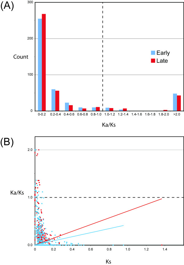 Figure 2. Functional constraints are similar in early and later stages of duplicate gene evolution in X. laevis paralogs. (A) Binned Ka/Ks of early (blue) and later (red) stages of duplicate gene evolution. (B) Regression of Ka/Ks versus Ks in the early and later stages indicates that selection (relaxed purifying + positive) is not more common in the early stage of duplicate gene evolution (blue dots) than the later stage (red dots). The Y-intercept of these regression lines was set to zero and Ka/Ks ratios greater 2 (including undefined ratios) were given a value of 2. In (A) and (B), a dashed line indicates the neutral expectation. Fragments with Ka/Ks > 2 are, on average, half of the size of those with Ka/Ks < 2. Ka/Ks ratios above 2 may therefore be attributable in part to stochastic variance in Ks [43].