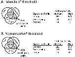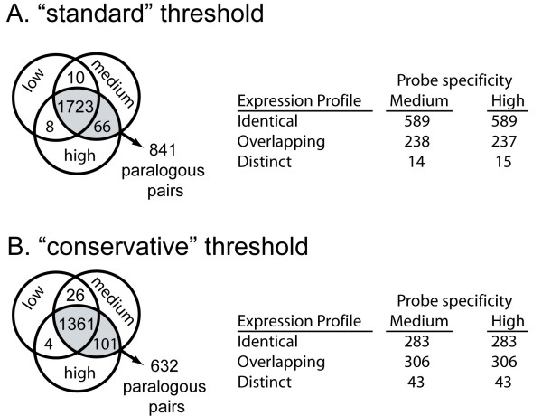 Figure 3. Expression of both paralogs is generally detected in the same treatments, irrespective of the probe specificity (the degree to which each probe matches one but not the other paralog) or the detection threshold (the minimum raw intensity scored as expressed). These data are based on (A) Standard and (B) Conservative threshold levels for detection of expression and three probe specificities were compared that are labeled low, medium, and high (see Methods). We report paralogous profiles whose presence/absence scores in all five treatments were identical in the medium and high specificity analysis (shaded in gray on the left of each chart). 1789 and 1462 genes had consistent present/absent expression profiles in the medium and high specificity analyses using the standard and conservative thresholds. These sets of genes included 841 and 632 paralogous pairs, respectively. The tables on the right compare paralogous profiles by tabulating whether they are both present and absent in the same treatments (identical), the expression profile of one overlaps entirely with the other (overlap), or paralogs in which each duplicate has a unique component (distinct).