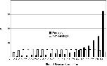 Figure 4. Binned expression profile correlations between 841 pairs of paralogs over five developmental stages or adult tissue types in the medium specificity analysis. The proportion of Pearson correlation coefficients between non-paralogous expression profiles (white bars) and between paralogous expression profiles (black bars). Ninety percent of the non-paralogous expression profiles have a Pearson correlation coefficient that is greater than -0.861 but less than 0.865. The Pearson correlation coefficients of 62% of the paralogous expression profiles are less than 0.865, and 0.3% of them are less than -0.861.