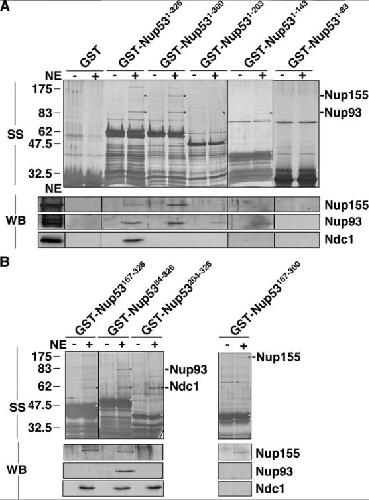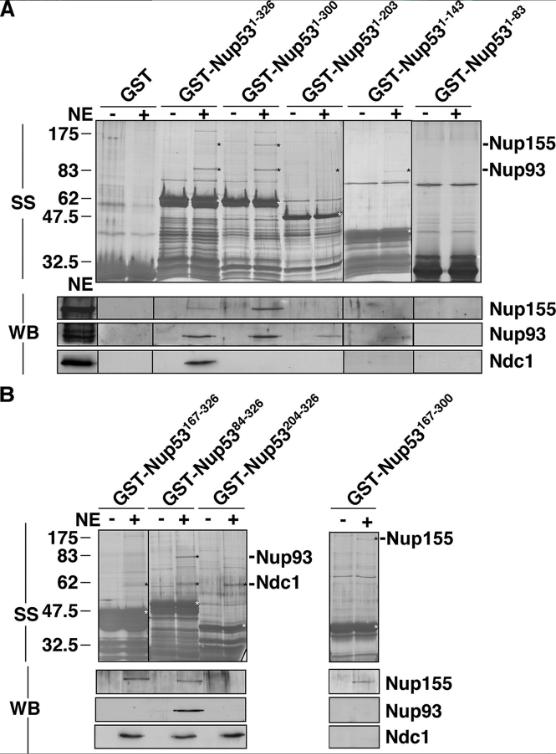 Figure 2. Nup53 domain interaction analysis using GST-pulldown assays. (AâC) Purified recombinant GST, GST-Nup53, or various GST-Nup53 truncations immobilized on glutathione-Sepharose 4B beads were incubated with extracts from purified rat liver NEs (+) or buffers alone (â). After binding and washing, bead-bound proteins were eluted, separated by SDS-PAGE, and detected with either silver staining (SS) or Western blotting (WB) by using antibodies against the indicated Nups. Positions of GST-fusions (white asterisks), relevant Nups (black asterisks and name), and mass markers are indicated in kilodaltons.