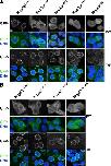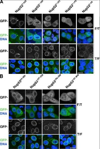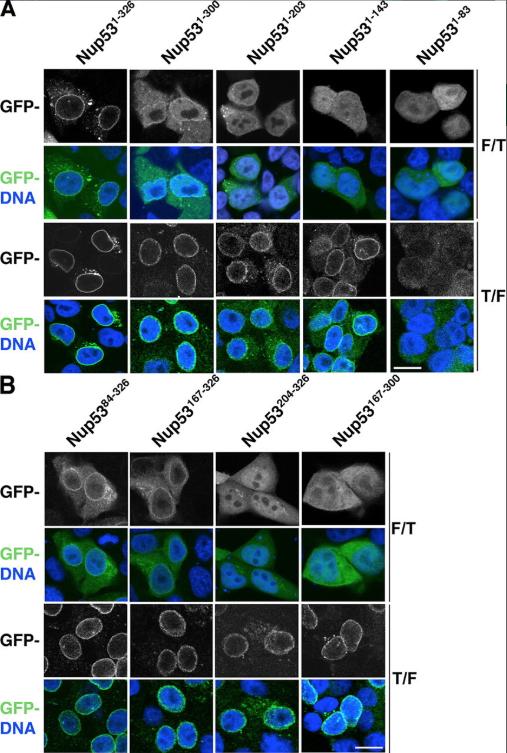 Figure 3. In vivo localization of enhanced green fluorescent protein (EGFP)âNup53 truncations. (A and B) Plasmids encoding either full-length Nup53 or the indicated truncations fused to EGFP were transfected into HeLa cells. Cellular distribution of the indicated GFP chimeras (GFP) and merged images of the GFP fusions and nuclear DNA was detected by staining with the DNA binding dye Hoechst (GFP-DNA) was determined by fluorescence microscopy following 36 h of transient expression. The transfected cells growing on coverslips were processed for fluorescence microscopy either by formaldehyde fixation followed by Triton X-100 permeabilization (F/T) or Triton X-100 permeabilization before formaldehyde fixation (T/F). Bar, 10 μm