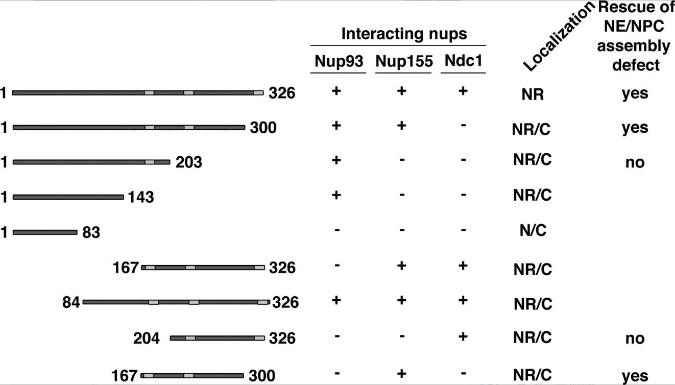 Figure 1. Summary of human Nup53 truncation characterization. Compilation of Nup53 truncation interaction, localization, and depletion phenotype rescue data. NH2- and COOH-terminal human Nup53 truncations were constructed based on regions that are well conserved among orthologues with considerations of predicted secondary structure. Helical stretches from amino acid residues 181â193, 216â226, and 314â326 are represented by light gray bars. Interaction data were obtained either by silver staining, Western blot, or both. Interactions detected (+) or not detected (â) between indicated Nups and Nup53 truncations are shown. Localization was scored as either nuclear rim (NR), nuclear (N), or cytoplasmic (C). The ability of the various Nup53 truncations to rescue the Nup53 depletion phenotype was monitored by DilC18 NE membrane staining.