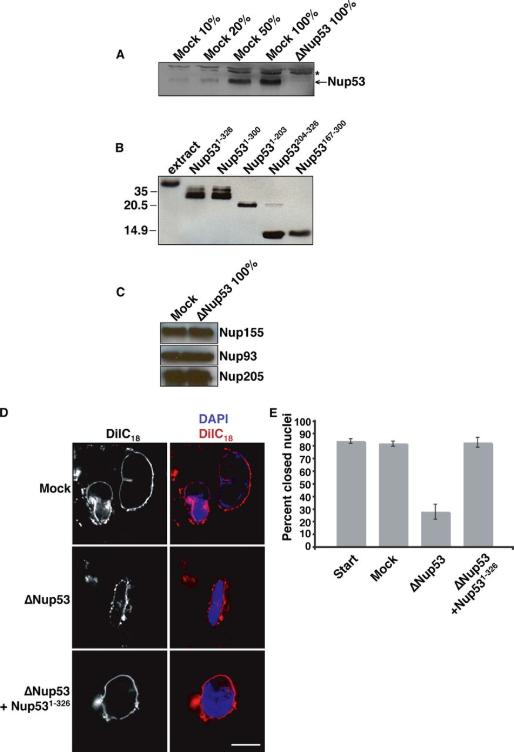 Figure 4. Depletion of Nup53 from cytosol blocks formation of a closed NE. (A) Amount of xNup53 in mock-depleted (Mock) and Nup53-depleted (ÎNup53) cytosolic extracts (equal volumes) were compared by SDS-PAGE and western blotting by using α-Nup53 antibodies. Varying amounts of untreated cytosol were loaded for comparison. A cross-reacting band indicated with an asterisk serves as a loading control. (B) For add-back experiments, amounts of recombinant proteins corresponding to approximately endogenous levels of Xenopus Nup53 (extract) were used. Purified full-length Nup531-326 and truncation fragments (Nup531-300, Nup531-203, Nup53204-326, and Nup53167-300) were analyzed by SDS-PAGE and Western blotting by using anti-Nup53 antibodies. Mass markers are indicated in kilodaltons. (C) Equal amounts of mock-depleted (Mock) or Nup53-depleted (ÎNup53) cytosolic extracts were analyzed by SDS-PAGE and Western blotting by using anti-Nup155, anti-Nup93, and anti-Nup205 antibodies. (D) Nuclei assembled in vitro in Mock, ÎNup53 extracts, or ÎNup53 extracts after addition of full-length Nup53. Membranes are visualized by using the membrane dye DilC18 (red). Chromatin was stained with 4,6-diamidino-2-phenylindole (DAPI) (blue). Bar, 10 μm. (E) Quantitation of closed NE formation of experiments performed as in D. More than 100 randomly chosen chromatin substrates per reaction were counted. Average of three independent experiments are shown, error bars represent the SD over the three experiments.