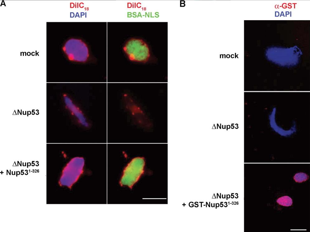 Figure 6. Characterization of in vitro-assembled nuclei. (A) Nuclei assembled in vitro in Mock, ÎNup53 extracts, or ÎNup53 extracts after addition of full-length Nup53. Nuclear import reaction was performed using fluorescein isothiocyanate (FITC)-labeled BSA-NLS 20â30 min before fixation. Membranes are visualized by using the membrane dye DilC18 (red). FITC BSA-NLS (green). Chromatin was stained with DAPI (blue). Bar, 10 μm. (B) Nuclei assembled in vitro in Mock, ÎNup53 extracts, or ÎNup53 extracts after addition of GST-Nup53. Localization of the recombinant protein was analyzed by immunofluorescence using α-GST (red). Chromatin was stained with DAPI (blue).