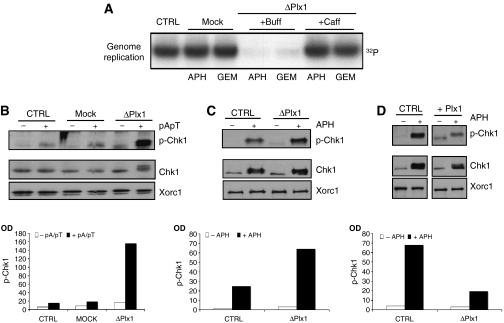 Figure 3. Plx1 suppresses the caffeine-sensitive intra-S-phase checkpoint. (A) The effects of caffeine on DNA replication under stress in the absence of Plx1. Sperm nuclei (7000 nuclei/μl) were replicated in extracts that were untreated (CTRL), mock depleted (Mock) or Plx1 depleted (ΔPlx1) in the presence of 2.5 μM aphidicolin (APH) or 40 nM geminin (GEM). Extracts were supplemented with buffer (Buff) or 5 mM caffeine (Caff). (B) Phosphorylation of Chk1 in untreated (CTRL), mock-depleted (Mock) and Plx1-depleted (ΔPlx1) extracts that were untreated (−) or supplemented with 50 ng/μl pApT (+). Western blot was performed with anti-phospho-Chk1 (p-Chk1), anti-Chk1 and anti-Xorc1 antibodies. Quantification was made by measuring optical density (OD) and is presented as a bar graph. (C) Chk1 phosphorylation in nuclei. Sperm nuclei were incubated with untreated extracts (CTRL) or with Plx1-depleted extracts (ΔPlx1). All extracts were untreated (−) or supplemented with 50 μM aphidicolin (+). The nuclei were isolated and the nuclear proteins were separated by SDS–PAGE. Western blot was performed with anti-phospho-Chk1 (p-Chk1), anti-Chk1 and anti-Xorc1 antibodies. (D) Sperm nuclei were incubated with untreated extracts (CTRL) or with extracts supplemented with 6 ng/μl Plx1 (Plx1) and processed as described above. All extracts were untreated (−) or supplemented with 50 μM aphidicolin (+). As described above, quantification of western blot signals in panels C and D was made by measuring OD and is presented as bar graphs.