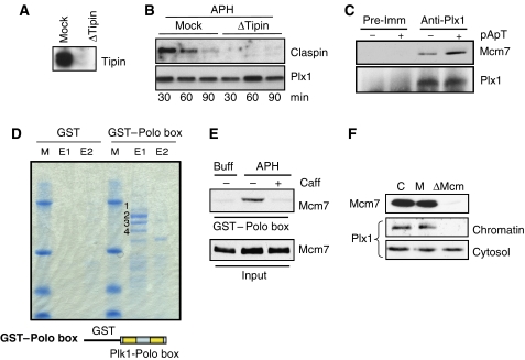 Figure 5. Plx1 interacts with the Mcm complex through its Polo box domain. (A) Immunodepletion of Tipin. Extracts were mock depleted (Mock) or Tipin depleted using anti-Tipin antibodies (ΔTipin). The cytosol was then subjected to western blot with anti-Tipin antibodies. (B) Plx1 and Claspin binding in Tipin-depleted extracts. Sperm nuclei were incubated in mock-depleted (Mock) or Tipin-depleted (ΔTipin) extracts in the presence of 2.5 μM aphidicolin (APH). Chromatin was isolated at the indicated time points and probed with anti-Plx1 and anti-Claspin antibodies. (C) Co-immunoprecipitation of Plx1 and Mcm7. Extracts that were untreated (−) or treated with 50 ng/μl pA/pT (+) were immunoprecipitated with pre-immune (Pre-Imm) or anti-Plx1 (Anti-Plx1) antibodies. Western blot was performed using anti-Mcm7 and anti-Plx1 antibodies. (D) Pull-down with GST–Polo box and MALDI-TOF analysis. Interphase extracts were incubated with GST–agarose beads or agarose beads with GST fused to the Polo box derived from human Plk1. After pull-down, proteins were consecutively eluted using 3 mg/ml of phosphopeptide solution (first elution=E1, second elution=E2, see Supplementary data for the sequence of the peptide and the Polo box) and subjected to MALDI-TOF analysis. Band 1 corresponds to Mcm2, band 2 to Mcm6, band 3 to Mcm4 and band 4 to Mcm7. The GST fusion protein containing the Polo box from Plk1 is shown at the bottom. (E) GST–Polo box pull-down of nuclear proteins probed with anti-Mcm7 antibodies (GST–Polo box). The extract used for the pull-down was supplemented with nuclei and buffer (Buff), 2.5 μM aphidicolin (APH) or 2.5 μM aphidicolin and 5 mM caffeine (Caff), as indicated. The total amount of unbound Mcm7 extracted from nuclei was loaded as a control (Input). (F) Effects of Mcm complex depletion on Plx1 binding to chromatin. The extract was untreated (C), mock depleted (M) or Mcm depleted (ΔMCM) using anti-Mcm3 antibodies and incubated with sperm nuclei for 60 min in the presence of 2.5 μM APH. Cytosol and chromatin were then subjected to western blot with anti-Mcm7 and anti-Plx1 antibodies.