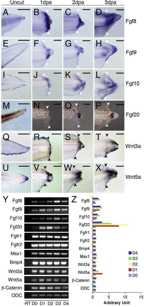Fig. 1. Gene expression profiles during Xenopus tadpole tail regeneration. (AâX) In situ hybridization detection of fgf8 (AâD), fgf9 (EâH), fgf10 (IâL), fgf20 (MâP), wnt3a (QâT) and wnt5a (UâX) in control tadpoles (A, E, I, M, Q, U; stage 42â43 tadpoles) and in tail regenerates 1â3 days post amputation (1 dpa: B, F, J, N, R, V; 2 dpa: C, G, K, O, S, W; 3 dpa: D, H, L, P, T, X; stage 48+ tadpoles). Arrowheads indicate amputation levels. Scale bars: 200 μm. dpa: day post amputation. (Y) RT-PCR detection of FGF, BMP and Wnt signalling components in tadpole tail immediately after amputation (D0) and 1â4 days post amputation (D1âD4). 1 mm of stump tissue was used to prepare RNA. ODC (ornithine decarboxylase) is used as loading control. (Z) Relative expression levels of genes detected by RT-PCR, based on the density of the PCR bands in (Y). The band density on D0 is the reference standard (1 arbitrary unit) in each gene group. Note that an increased in situ signal may correspond to a limited overall change in the larger tissue region used for RNA analysis. |