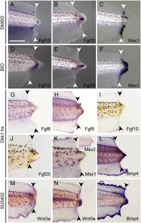 Fig. 6. Gene expression detection in dkk1 heat shock and small molecule treated tadpole tails. (AâF) In situ hybridization detection of fgf10 (A, D), fgf20 (B, E), msx1(C, F) in tadpoles treated with DMSO alone (AâC) or 50 nM BIO (DâF). (GâL) In situ hybridization detection of fgf8 (G), fgf 9 (H), fgf10 (I), fgf20 (J), msx1 (K), msx2 (inset in panel K) and Bmp4 (L) in dkk1 transgenic tadpole tails with heat shock treatment, 3 days post amputation. (MâO) In situ hybridization detection of wnt3a (M), wnt5a (N) and Bmp4 (O) in wild type tadpole tails treated with 100 μM SU5402, 3 days post amputation. Arrowheads indicate amputation levels. Scale bar: 500 μm. |