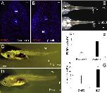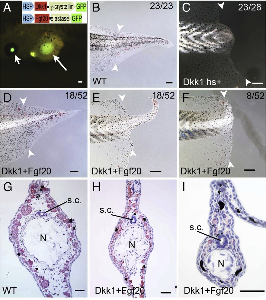 Fig. 5. Tail regeneration in dkk1+fgf20 double transgenic tadpoles. (A) A tadpole with both dkk1 transgene as indicated by the green lens (short white arrow) and fgf20 transgene as indicated by the green pancreas (long white arrow). Transgenic constructs used are shown in inset. (B) Tail regeneration in wild type tadpoles after 7 days' heat shock treatment (23 of 23 in total). (C) Tail regeneration in dkk1 transgenic tadpoles with heat shock treatment for 7 days. Most dkk1 transgenic tadpoles failed to regenerate (23 of 28), some regenerated partially (5 of 28, similar as shown in panel F). (D) Tail regeneration in dkk1 and fgf20 double transgenic tadpoles, with heat shock treatment for 7 days. (D) Full tail regeneration (18 of 52). (E) Partial tail regeneration (18 of 52). (F) Partial tail regeneration (8 of 52). Some dkk1 and fgf20 double transgenic tadpoles failed to regenerate (8 of 52, similar as in panel C). (G) Representative cross sections of tail regenerates in wild type tadpoles (G) and fully regenerated (H) or partially regenerated (I) tail in dkk1 and fgf20 double transgenic tadpoles. Cross sections were immunostained with 12/101 mAb and conterstained with Haematoxylin. N: notochord, s.c.: spinal cord. White arrowheads in panels B indicate amputation levels. Scale bars in panels A: 250 μm; scale bars in panels G: 100 μm. |