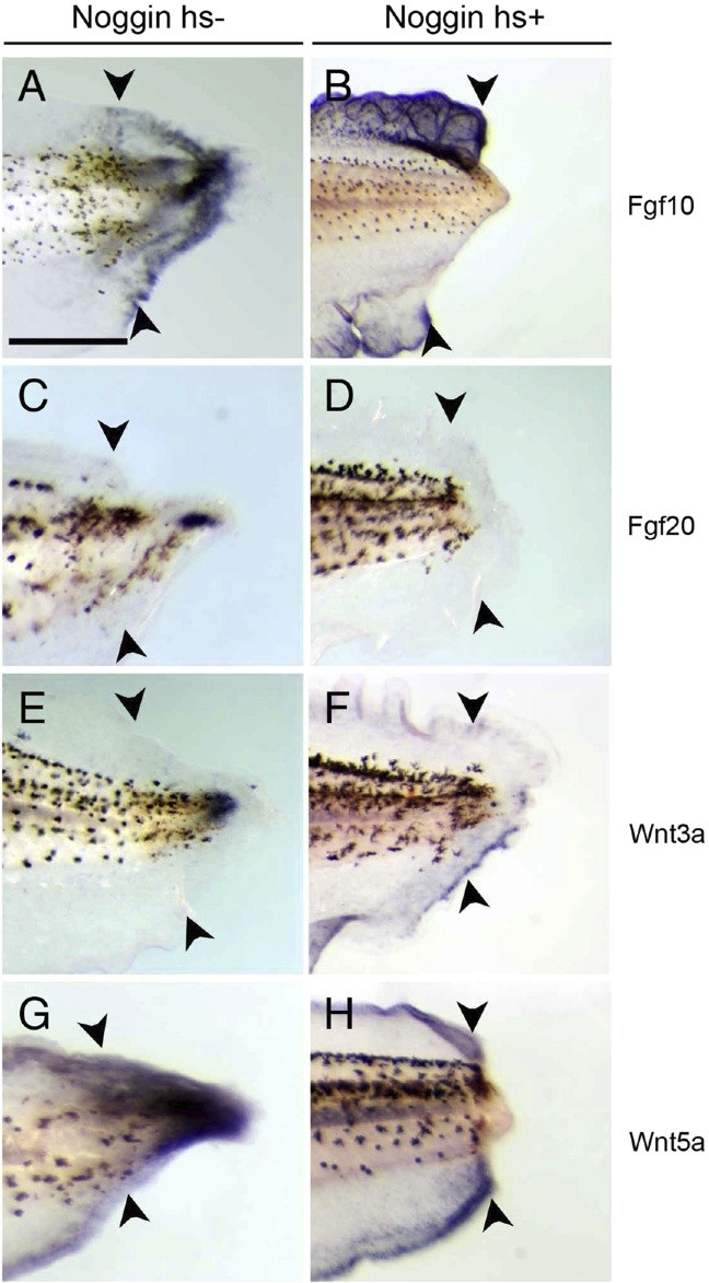 Fig. 7. Expression of wnts and fgfs in wild type and in noggin transgenic tadpole tail regenerates. (A, C, E, G) Tail regenerates of noggin transgenic tadpoles with in situ hybridization detection of fgf10 (A), fgf20 (C), wnt3a (E) and wnt5a (G), 3 days post amputation, without heat shock treatment. (B, D, F, H) with heat shock treatment 3 h before amputation and every 24 h after amputation. Arrowheads indicate amputation levels. Scale bar: 500 μm. |