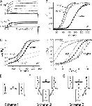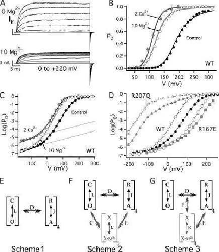 Figure 2. Effects of Mg2+ on steady-state activation. (A) Effect of 10 mM Mg2+ on macroscopic IK evoked from mSlo1 channels in response to 50-ms pulses to different voltages in 0 Ca2+ from a holding potential of −80 mV. Mg2+ decreases outward current at high voltages owing to rapid pore block. However tail currents indicate an increase in PO and slowing of channel deactivation. (B) Mean normalized GK-V relations (Po = GK/GKmax) determined from tail currents in 10 mM Mg2+(O), 2 μM Ca2+(♦) or the absence of divalent cations (control, •). (C) Mean log(PO)-V relations corresponding to B achieve a weakly voltage-dependent limiting slope at extreme negative voltages, indicating that voltage sensors are in the resting state. Dotted lines are exponential fits to control and Ca2+ data with partial charge zL = 0.3e (Ma et al., 2006). (D) Voltage sensor mutations R207Q (▵, ▴) and R167E (□, ▪) shift both the voltage dependence of activation and Mg2+ sensitivity (0 Mg: filled symbols; 10 mM Mg2+: open symbols) relative to the WT (O, •), implying that Mg2+ action depends on voltage sensor activation and is not intrinsically voltage dependent. (E) Voltage-gating mechanism (Scheme 1). Channels undergo a closed–open (C-O) conformational change that is allosterically regulated by four independent and identical voltage sensors that can undergo a resting-activated (R-A) transition. L and J are voltage-dependent equilibrium constants (L = L0exp(zLV/kT), J = J0exp(zJV/kT) = exp(zJ[V − VhC]/kT)) and D is an allosteric factor. (F) Scheme 2 includes a ligand-binding transition (X-X·M2+) in each subunit that allosterically regulates channel opening and voltage sensor activation as described by factors C and E, respectively. Solid curves in B and C represent a fit of this model to Ca2+-dependent activation in 0–100 μM Ca2+ (Horrigan and Aldrich, 2002) (VhC = 156 mV, zJ = 0.58e, L0 = 1.06 × 10−6, zL = 0.3e, KD(Ca2+) = 11 μM, C = 8, D = 24.4, E = 2.4). The same model with identical values of VhC, zJ, L0, zL, D, and E can fit the Mg2+ data (dotted curves) if Mg2+ binding is assumed to be voltage dependent (i.e., KD(Mg2+) = KD(0)exp(−Vγ2e/kT)) (KD(0) = 9.35 mM, γ = 0.2, C = 1.66) (G) Scheme 3 assumes that ligand binding allosterically regulates voltage/sensor gate coupling and voltage sensor activation as described by allosteric factors F and E, respectively. |