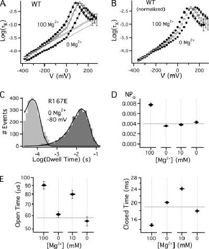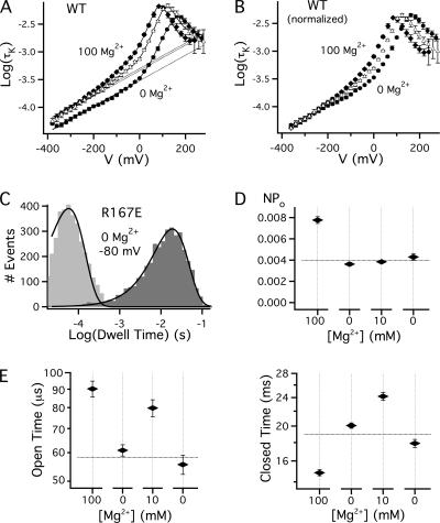Figure 7. Effects of Mg2+ on IK kinetics. (A) Mean log(τK)-V relations in 0 (•), 10 (▵), and 100 (♦) mM Mg2+. Dotted lines are fits to the limiting slope of τK between −380 and −240 mV with an exponential function with partial charge −0.135e. Solid curves are fits to Scheme 1* (Fig. 6 D) using parameters in Table III. (B) τK-V relations from A were normalized to the 0 Mg2+ relation based on the exponential fits. (C) Open and closed dwell-time histograms for R167E at −80 mV in 0 Mg2+ from a patch containing ∼10,000 channels. Dwell time histograms were log-binned and are fit by single exponential functions, consistent with a two-state closed–open transition when voltage sensors are in the resting state. (D) NPO at −80 mV measured from steady-state recordings of 20-30 s total duration in the same patch as C as [Mg2+] was changed in sequence from 100 mM to 0, 10 mM, and back to 0 Mg2+. The data were acquired in 5-s traces and error bars represent the standard error of measurements from individual traces. (E) Mean open and closed times corresponding to D. Dotted lines in D and E indicate the mean value in 0 Mg2+. |