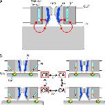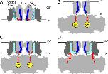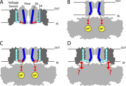Figure 1. Proposed pathways of sensor/gate interaction for different channels. (A) Kv1.2, where the charged S4 segment (light blue) in the voltage sensor is proposed to interact with the S6 activation gate (dark blue) in the pore via the S4–S5 linker (arrows). The outlines of the S1–S4 voltage sensor domain and S5–S6 pore domain for two subunits from the Kv1.2 crystal structure (Long et al., 2005a) are shown in dark and light gray, respectively, and are truncated at S1 (protein data bank code 2A79). (B) MthK, where Ca2+ binding to the cytosolic domain is proposed to cause a conformational change that pulls open the gate through short peptide linkers (dashed lines) that are unresolved in the crystal structure (Jiang et al., 2002) (protein data bank code 1LNQ). The attachment points of the linker on the cytosolic domain (in foreground and background) have been altered to better illustrate that linkers are pulled away from the pore axis. (C) A hypothetical BK channel structure formed by appending the Kv1.2 voltage sensors to MthK shows how Ca2+ and voltage may both interact with the gate to have independent effects on activation. The position of the voltage sensors was determined by superimposing the pore domains of Kv1.2 (residues 341–406) and MthK (residues 26–91) in PyMol (http://www.pymol.org). (D) The hypothetical BK channel structure also illustrates the possibility that the large cytosolic domain may interact directly with voltage sensors. |